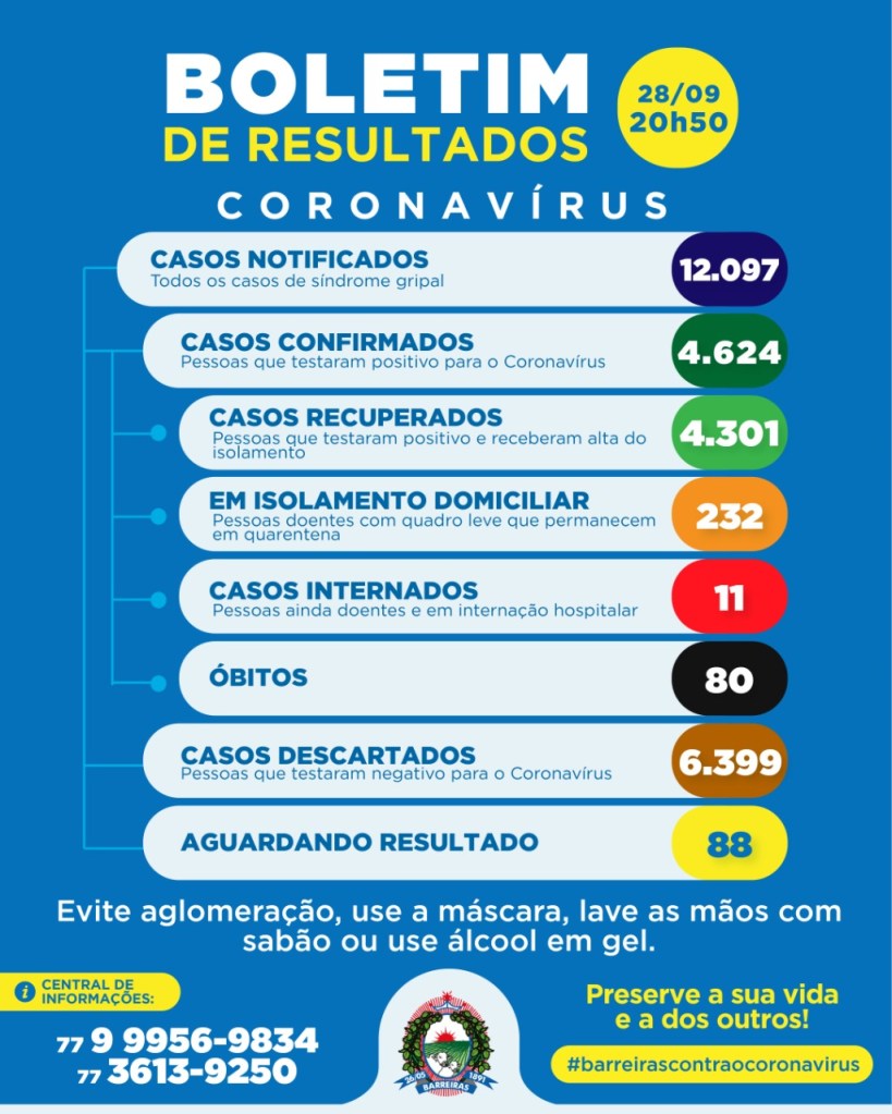 Até o momento, Luís Eduardo Magalhães tem 2.865 (dois mil, oitocentos e sessenta e cinco) casos confirmados da doença e 32 óbitos decorrentes.