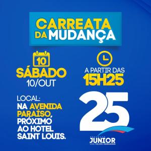 A assessoria de imprensa do candidato Júnior Marabá está convidando para uma carreata, neste sábado, dia 10, com partida às 15h25m da Avenida Paraíso, próximo ao Hotel Saint Louis.