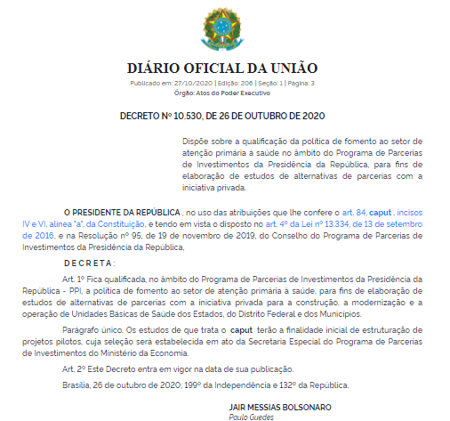 Jair Bolsonaro assinou o Decreto nº 10.530/2020, publicado nesta terça-feira (27) que institui a Estratégia Federal de Desenvolvimento para o Brasil para o período de 2020 a 2031 e, entre outras medidas, entrega para a iniciativa privada a gestão da atenção primária à saúde, o que inclui as Unidades Básicas de Saúde.