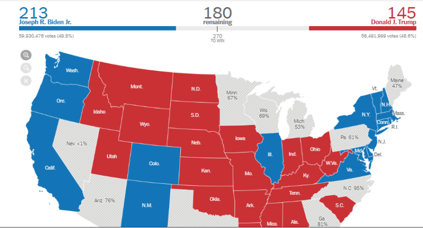 Segundo o jornal New York Times, autor do infográfico acima, na Califórnia Biden estás ganhando de com 68% contra 30% de Trump, quase 4 milhões de votos à frente. Trump venceu na Flórida, outro estado importante, com vantagem apertada, mas definitiva. Com a vitória pulou para 174 delegados.