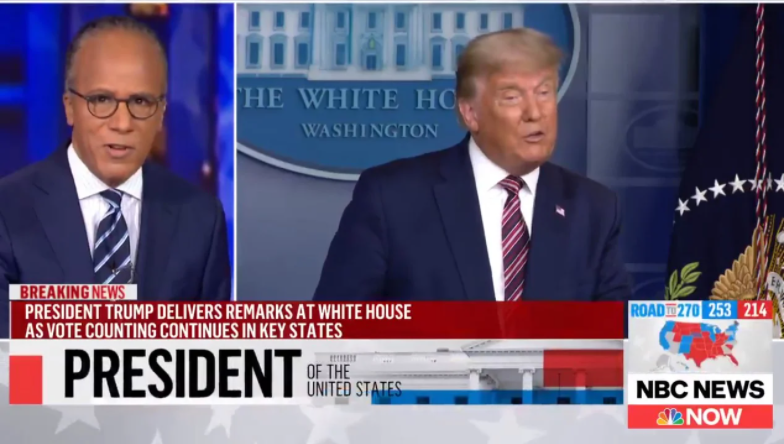 “Tivemos que interromper o presidente porque ele fez uma série de falsas acusações que davam a entender que houve uma fraude nas eleições e não há nenhuma evidência disso”, disse Lester Holt, âncora do NBC Nightly News logo após a emissora cortar a fala do presidente.