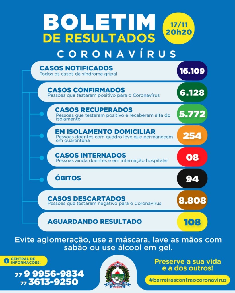 Barreiras: 48 casos confirmados e mais 36 casos suspeitos nas últimas 24 horas.