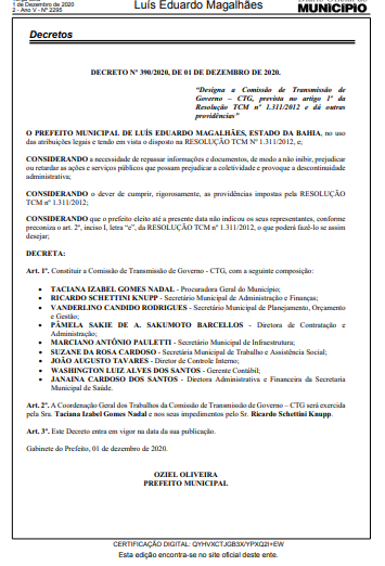 Luís Eduardo Magalhães: Prefeito designa membros da comissão de transição.