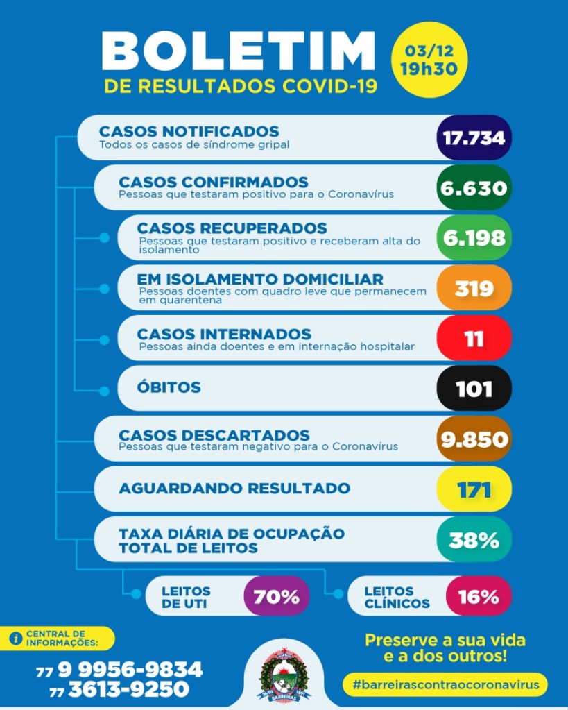 Barreiras contabiliza hoje 17.734 (dezessete mil setecentos e trinta e quatro) casos notificados, sendo que o primeiro caso notificado no Sistema e-SUS VE foi em 26 de março de 2020. E 9.850 (nove mil oitocentos e cinquenta) casos descartados, cujos resultados foram negativos.