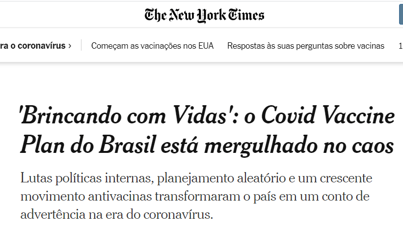 O jornal New York Times fez uma longa matéria, na publicação de ontem, condenando os planos aleatórios e disputas políticas de enfrentamento da pandemia.