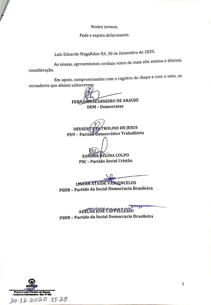 Foi protocolado hoje, 30, na Câmara Municipal de LEM o Requerimento de Registro de Chapa nº 01/2021, assinado pelos vereadores Nei Vilares (DEM), Daiana Pires (Patriotas), Silvano Santos (DEM), Zezília Martins (Avante), Fernando Carneiro (DEM), Deusdete de Jesus (PDT), Sandra Colpo (PSC), Lisvan Vasconcelos (PSDB) e Adelar Cappellesso (PSDB), para eleição da mesa diretora da casa legislativa no biênio 2021/2022.