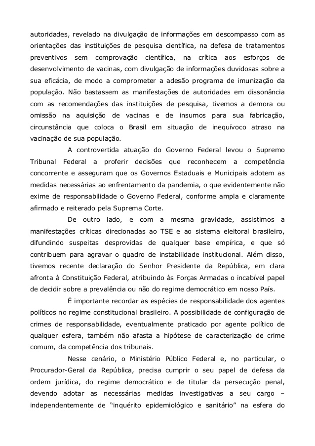 “Não bastassem as manifestações de autoridades em dissonância com as recomendações das instituições de pesquisa, tivemos a demora ou omissão na aquisição de vacinas e de insumos para sua fabricação, circunstância que coloca o Brasil em situação de inequívoco atraso na vacinação de sua população”, diz o documento.