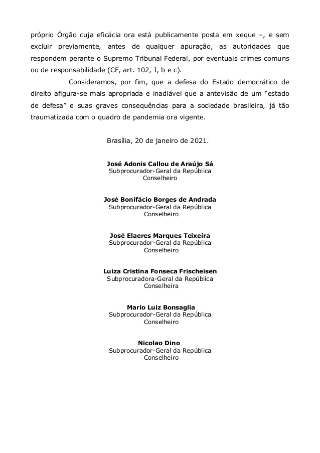 “Consideramos, por fim, que a defesa do Estado democrático de direito afigura-se mais apropriada e inadiável que a antevisão de um ‘estado de defesa’ e suas graves consequências para a sociedade brasileira, já tão traumatizada com o quadro de pandemia ora vigente”, acrescentam.