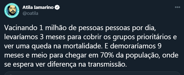 Mesmo com um milhão de vacinados por dia, levaríamos 9 meses para cobrir 70% da população