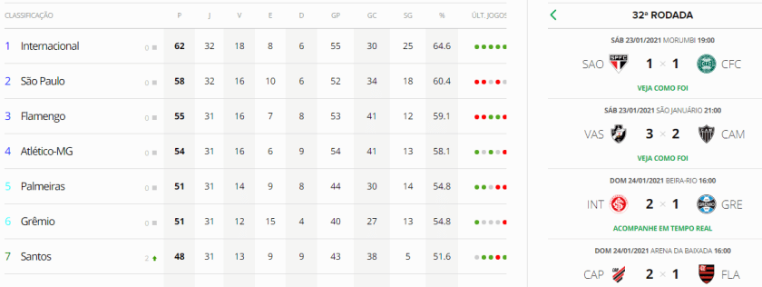 Ainda, o Flamengo, em terceiro, perdeu para o Athletico-PR e ficou com 55.
