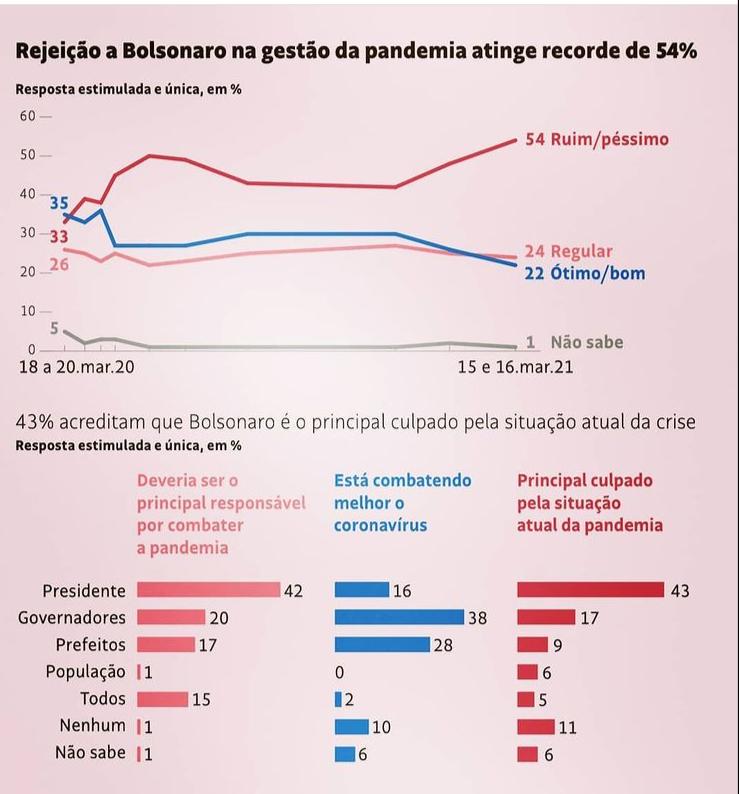 A rejeição à ação de Jair Bolsonaro na gestão da pandemia da Covid-19 disparou ao maior nível desde que a crise sanitária começou, há um ano, segundo pesquisa do Datafolha divulgada nesta quarta-feira (17). 54% dos brasileiros veem sua atuação como ruim ou péssima. Na rodada passada, realizada em 20 e 21 de janeiro, 48% reprovavam o trabalho de Bolsonaro. 45% dizem nunca acreditar em Bolsonaro.