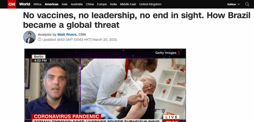 Sem vacina, sem liderança, sem solução no horizonte. Como o Brasil se tornou uma ameaça global”. Este é o título de uma reportagem da CNN Internacional, estampada na capa do site da emissora dos Estados Unidos neste sábado (20).