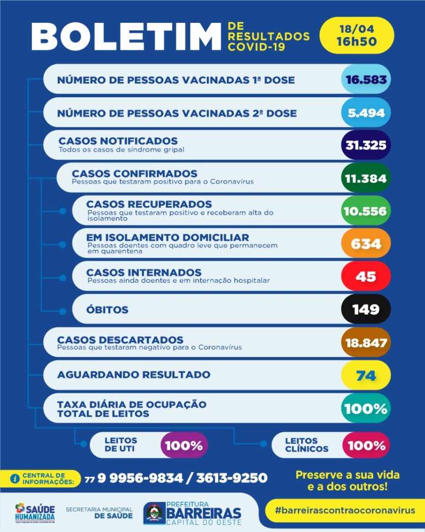 Nas últimas 24 horas, foram notificadas 2.574 novas contaminações pelo novo coronavírus e 75 mortes. Com isso, a Bahia acumula agora, desde o início da pandemia, 862.334 casos confirmados da Covid-19 e 17.303 óbitos em decorrência da doença.