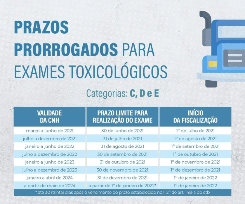 Por causa dos impactos da pandemia da Covid-19 no transporte de cargas, o cumprimento dos prazos ficou comprometido. O Contran decidiu então publicar na última quarta-feira (28) a deliberação nº 222, que prorrogou os prazos dos exames e criou um novo calendário, de acordo com o vencimento da habilitação, além de estabelecer as datas para o início da fiscalização. O exame toxicológico é capaz de identificar a presença de substâncias psicoativas no organismo, como cocaína e anfetaminas, e deve ser feito em laboratório credenciado ao Departamento Nacional de Trânsito (Denatran).