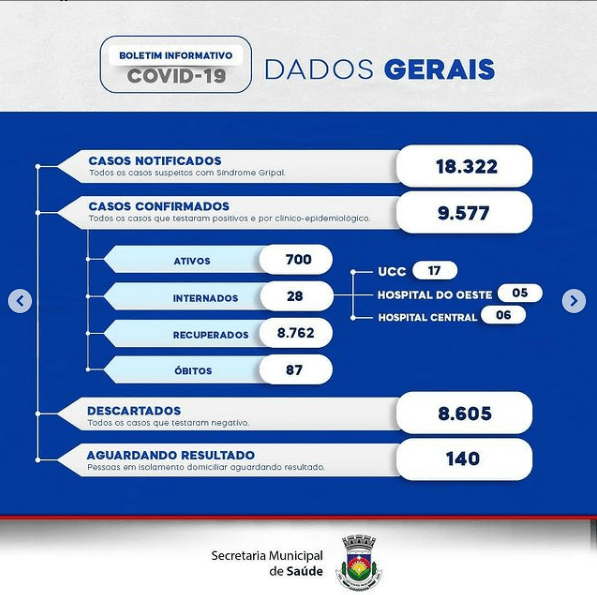 A Secretaria de Saúde registra atualmente 14.785 casos confirmados por Teste Rápido e RT-PCR. Praticamente 10% da população. Destes, 13.732 estão recuperados.