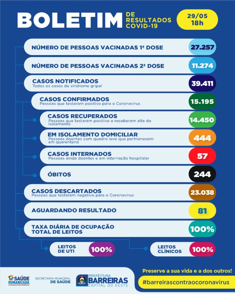 A Prefeitura de Barreiras informou que no dia de hoje foram concluídos 119 (cento e dezenove) resultados de testes de Covid-19, sendo que 84 (oitenta e quatro) testaram negativos e 35 (trinta e cinco) testaram positivos.