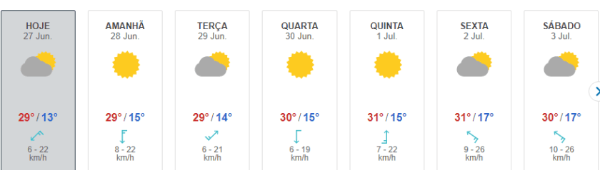 A máxima aumenta pouco nos próximos dias, até 31ºC, enquanto a mínima permanece entre 17 e 19ºC.