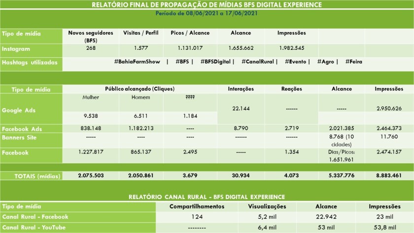 Dados divulgados em relatórios pós-evento mostraram que os conteúdos referentes a Bahia Farm Show Digital Experience teve um alcance de mais de 5,3 milhões de visualizações nas redes sociais, e um total de mais de 8,8 milhões de impressões. Para quem não sabe, as impressões revelam o número de vezes que um post ou o perfil apareceu na tela dos usuários.
