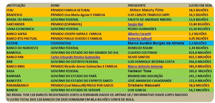 Sob Paulo Guedes e Jair Messias Bolsonaro, 118 bancos brasileiros lucraram, em 2020, mais de 100 bilhões de reais. Só o banco do próprio Ministro, o BTGP digital lucrou mais de R$4bilhões, superando vários bancos tradicionais.