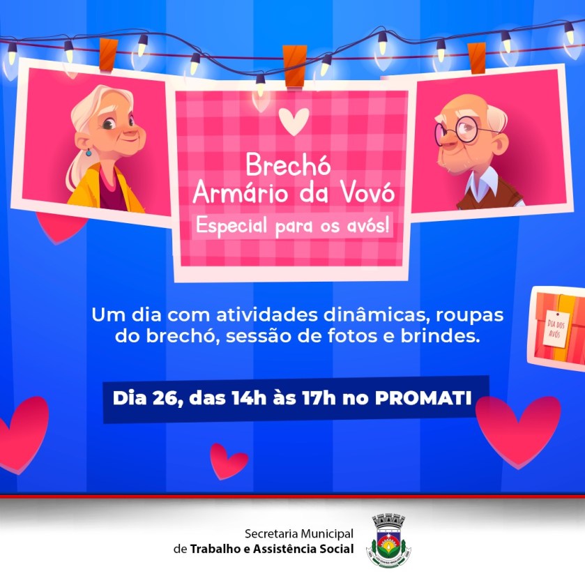 Acontece hoje, segunda-feira, das 14h às 17h, no Programa Municipal PROMATI, no bairro Santa Cruz, em comemoração ao Dia dos Avós, o ‘Brechó Armário da Vovó’.