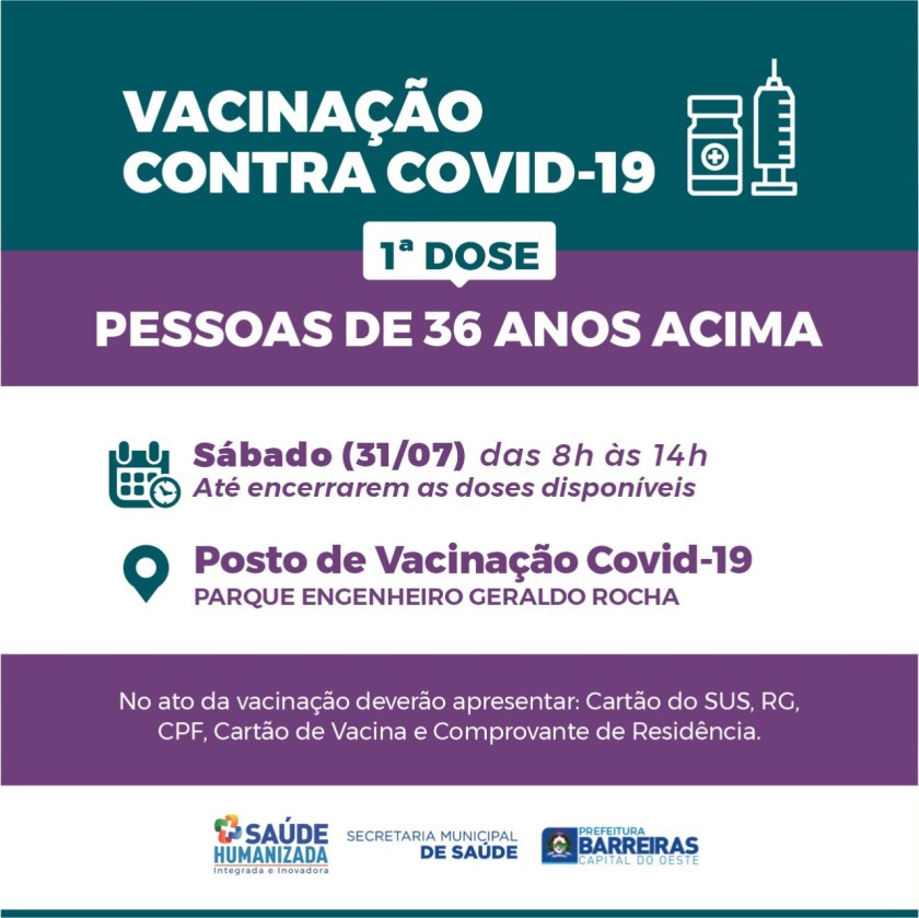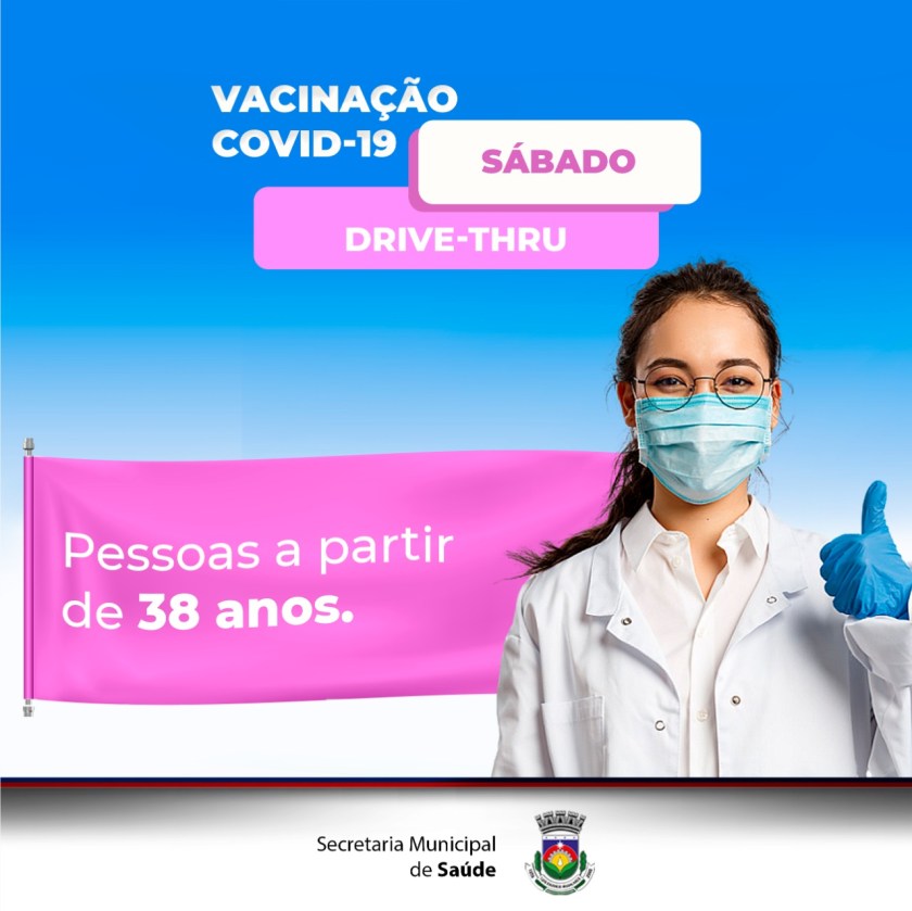 A Prefeitura de Luís Eduardo Magalhães, através da Secretaria de Saúde realiza neste sábado (31), das 8h às 12, no sistema Drive-Thru, vacinação para primeira dose contra o Covid-19, para pessoas a partir dos 38 anos de idade.