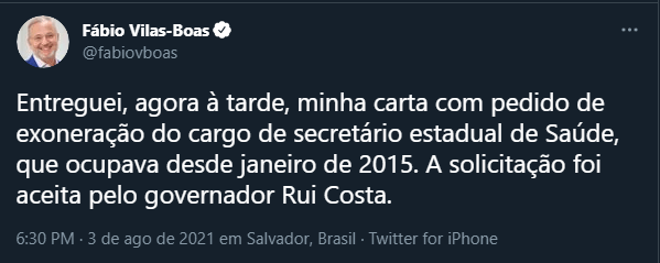 O médico Fábio Vilas-Boas acaba de informar seu pedido de exoneração da chefia da Secretaria de Saúde do Estado da Bahia (Sesab). Ele protagonizou um episódio de agressão verbal contra a dona do restaurante Preta, Angeluci Figueiredo. “Entreguei, agora à tarde, minha carta com pedido de exoneração do cargo de secretário estadual de Saúde, que ocupava desde janeiro de 2015. A solicitação foi aceita pelo governador Rui Costa”, escreveu Vilas-Boas no Twitter.