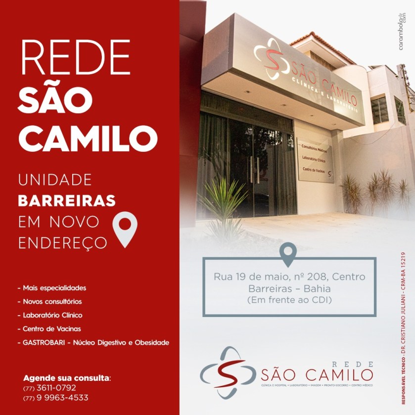 Com uma estrutura maior e ainda mais confortável, a Rede São Camilo acaba de ampliar os cuidados com seus pacientes em Barreiras. Localizada na rua 19 de maio, nº 218, Centro (em frente ao CDI), a nova clínica disponibiliza mais especialidades com profissionais altamente capacitados, modernos consultórios, laboratório clínico e centro de vacinas.