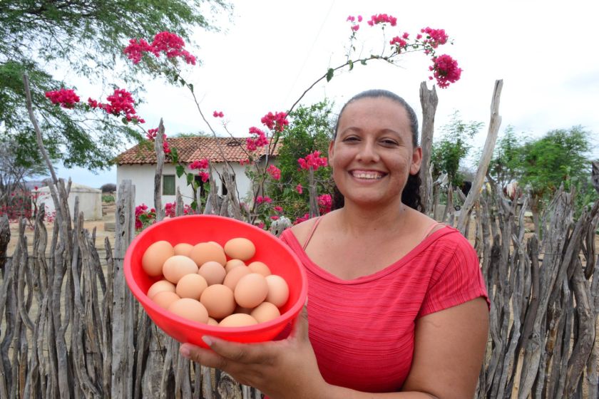 Com os recursos de mais de R$ 6,7 milhões aplicados em construção de galinheiros rústicos, aquisição de motoforrageiras, compra de aves e implantação de ensaios forrageiros agroecológicos (áreas de experimentação e cultivo de forragem para animais), o Pró-Semiárido tem aumentado a renda de 2.255 famílias agricultoras com a criação de galinhas e a venda dos ovos.