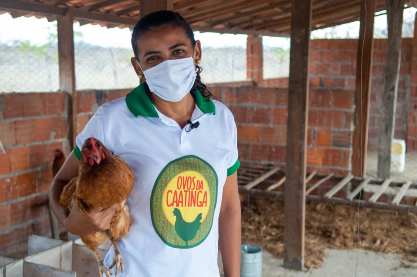 Jaciara Santos, da comunidade de Canoa, no município de Juazeiro, está entre as beneficiadas. Associada da Cooperativa Agropecuária Familiar de Massaroca e Região (Coofama), ela conta que esse apoio representou um grande passo para sua independência, com a venda de ovos pela cooperativa para o Entreposto Ovos da Caatinga, primeiro empreendimento da agricultura familiar certificado pelo Serviço de Inspeção Municipal (SIM) do município e que também é parte dos investimentos do governo do estado em avicultura: “Mora eu e meu pai, que é aposentado e precisa dos meus cuidados. Com o trabalho na minha roça, eu faço meus horários. Hoje, estou com 280 aves com postura e tiro, em média, R$1.700,00 por mês”.