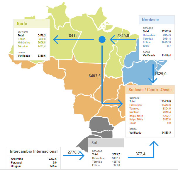 Veja abaixo o quadro de distribuição de energia em todo o País, posição informada às 01h56m desta madrugada. O Nordeste, com as suas térmicas, eólicas e hidrelétricas está exportando 8.032 MW para o Sudeste e 841,5 MW para o Norte. Argentina e Uruguai estão exportando para o Sul, que também remete uma sobra de 377,4 MW para o Sudeste.