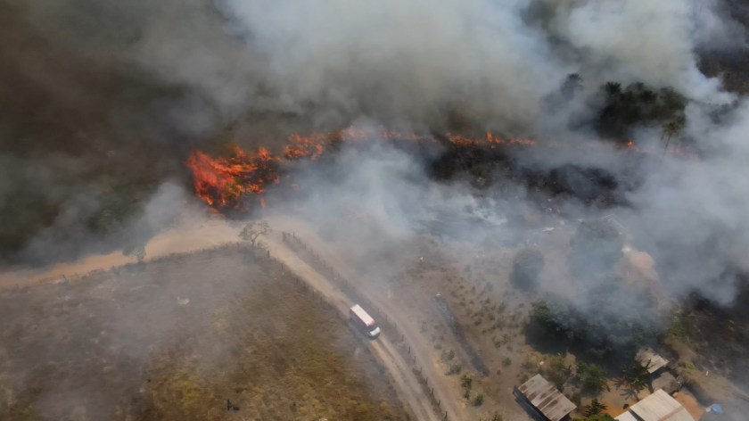 O combate continua na comunidade de Sangueiro. Nesta segunda-feira (20) os bombeiros evitaram que o incêndio atingisse a sede de uma fazenda. Um avião modelo Air Tractor continua realizando o combate e monitoramento aéreos.