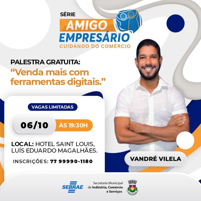 A Prefeitura de Luís Eduardo Magalhães, através da Secretaria de Indústria, Comércio e Serviços, em parceria com o Sebrae, realiza nesta quarta-feira (06), às 19h30, no Hotel Saint Louis, a palestra gratuita “Venda mais com ferramentas digitais”, com Vandré Vilela.
