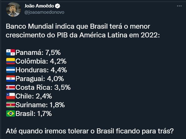 No Twitter, Amoedo reclama da curva abissal de crescimento do Brasil.