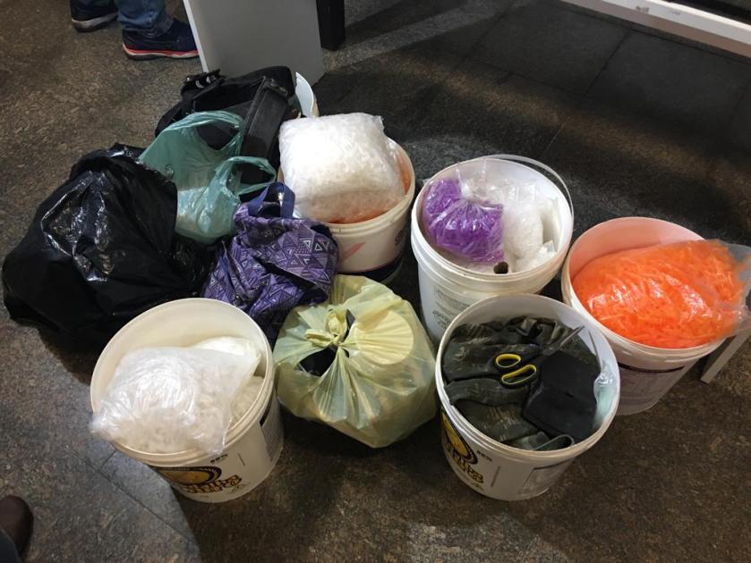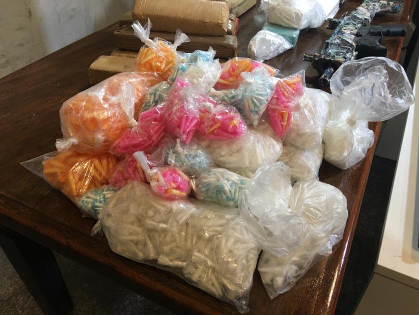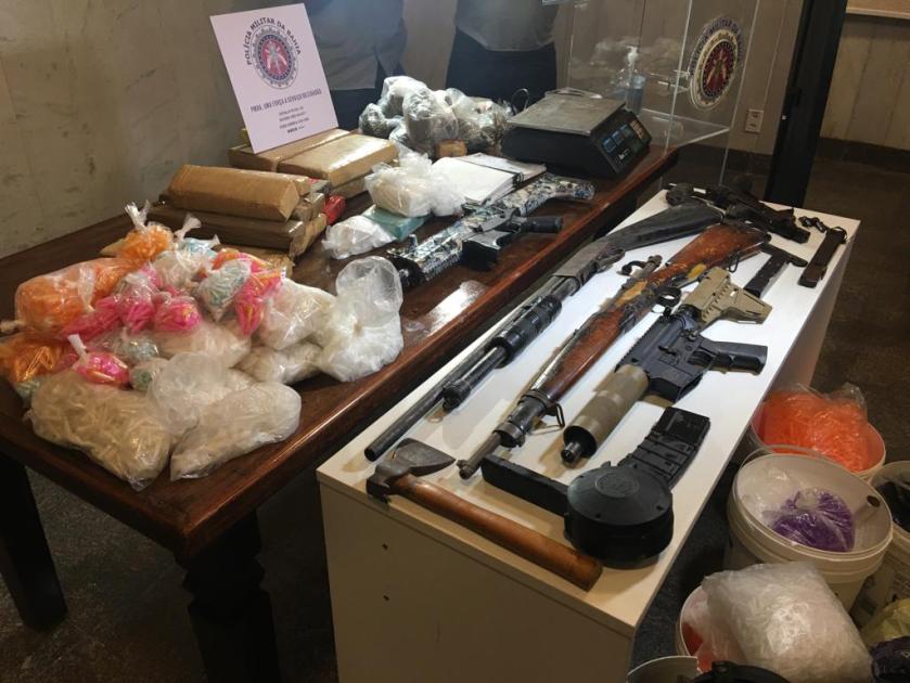 Foram apreendidos uma carabina calibre 40, um fuzil calibre 5.56, uma espingarda calibre 12, um fuzil calibre 7.62, uma submetralhadora artesanal, carregadores de armas de diversos tipos, balanças de precisão, aproximadamente 2.000 pinos de cocaína e 17,5kg de maconha, 2kg de pasta-base, dentre outros materiais de destinação ilícita.
