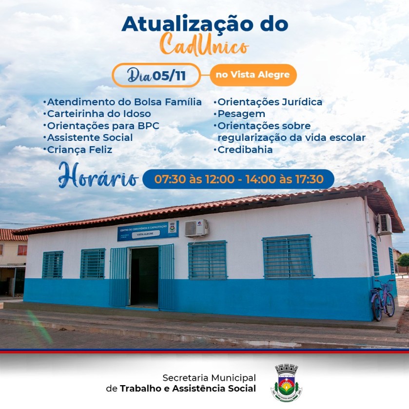 A 4º edição do Bolsa Família em Ação acontecerá nesta sexta-feira, dia 05, das 7h30 às 12h e das 14h às 17h30, no bairro Vista Alegre, em Luís Eduardo Magalhães. Uma ação da Prefeitura, através da Secretaria de Trabalho e Assistência Social.