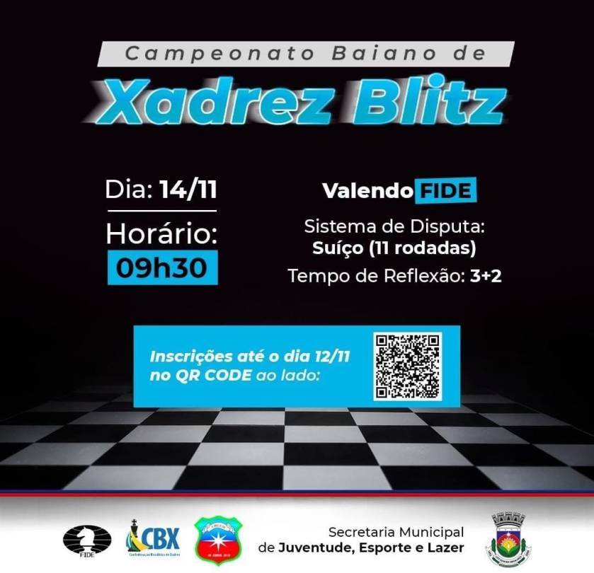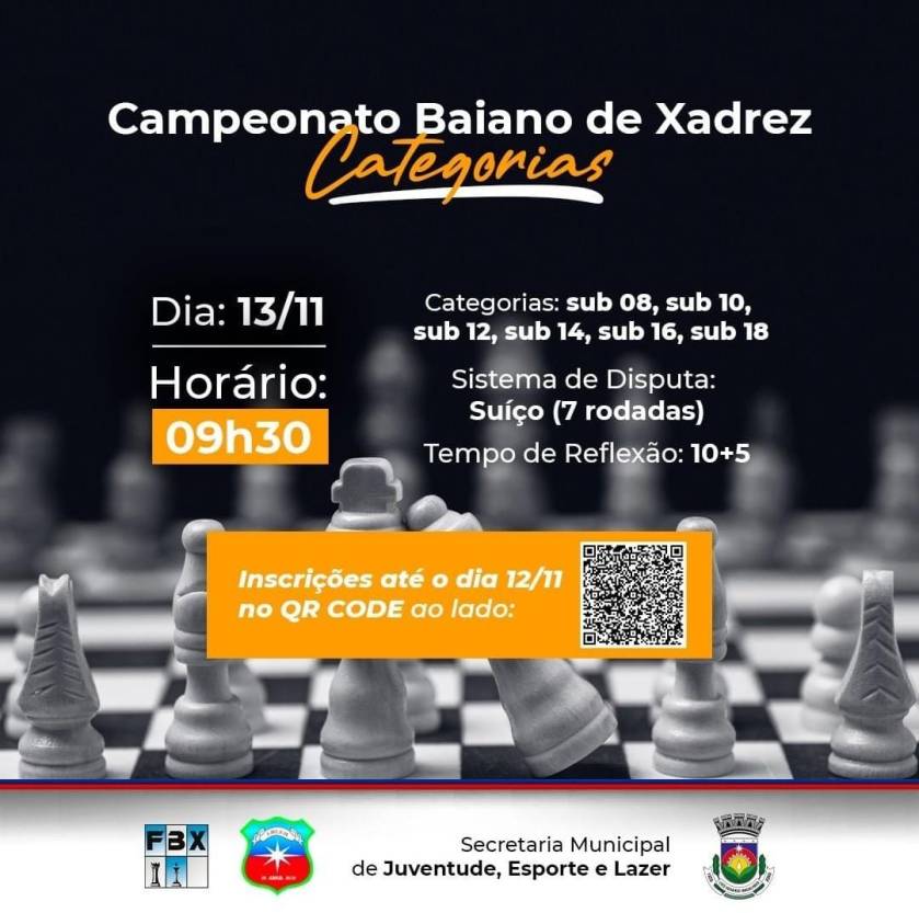 No dia 13, a partir das 9h30 e seguindo durante todo o dia, acontece o Campeonato Baiano de Xadrez feminino e masculino, nas categorias sub 08/ sub 10/ sub 12/ sub 14/ sub 16/ sub 18;