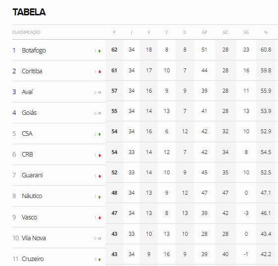 Veja abaixo a tabela dos primeiros classificados na Série B: