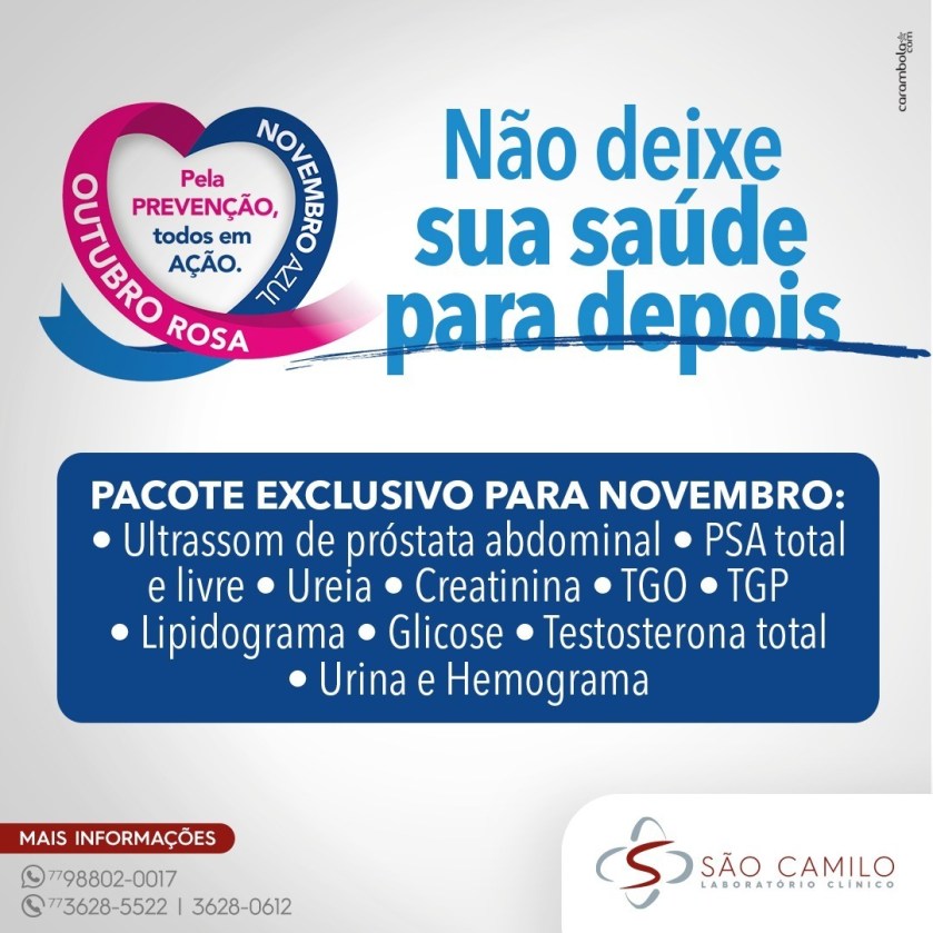 O câncer de próstata é muito sério e precisa ser monitorado. Para isso, a realização de exames é fundamental. Homem, não deixe a saúde para depois. Passe no Laboratório São Camilo e aproveite o check-up exclusivo para novembro.