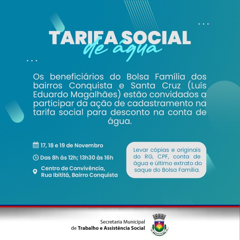 Os beneficiários do Bolsa Família dos bairros Conquista e Santa Cruz, em Luís Eduardo Magalhães estão convidados a participar da ação de cadastramento na tarifa social para desconto na conta de água.