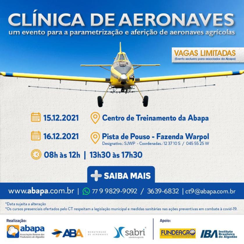 Como parte deste plano, entre os dias 13 e 18 de dezembro, a Abapa apoiará a realização de um evento-piloto que evidenciará sua atenção a este tema, assim como irá medir o interesse do público. Os participantes terão uma visão geral acerca de todos os pontos de calibragem presentes nas aeronaves agrícolas. A iniciativa será desenvolvida em parceria com as empresas SABRI e a ABA Manutenção de Aeronaves.