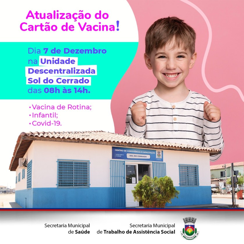 Os moradores do bairro Sol do Cerrado e Solar dos Buritis terão a oportunidade de atualizar o cartão vacinal das crianças, nesta terça-feira (07), na unidade descentralizada da Secretaria  de Trabalho e Assistência Social. Das 8h às 14h.