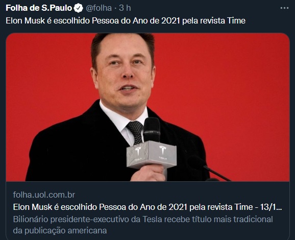 Que grande injustiça! Colocamos todos os bots (robôs) do Escritório do Ódio a serviço da eleição de nosso Mito, Jair Messias, e chega na hora H os editores e jornalistas da Time escolhem esse tal de Elon Musk como Personalidade do Ano.