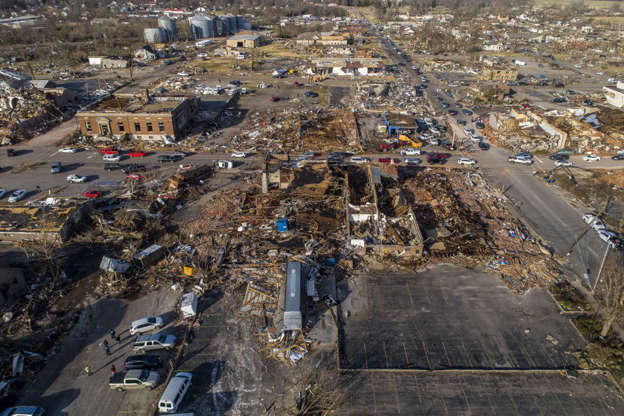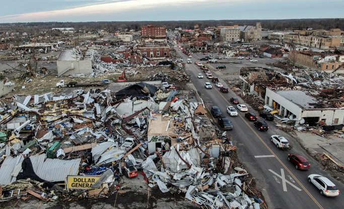 Danos causados na cidade de Mayfield (Kentucky). Até 30 tornados devastaram tudo em seu caminho pelos Estados de Kentucky, Illinois, Missouri, Arkansas, Mississippi e Tennessee. Vista aérea dos danos causados pelo tornado em suas terras na cidade de Mayfield (Kentucky). O governador deste estado, Andy Beshear, alertou que “o número total de mortos pode ser superior a 100”. “Os relatórios são verdadeiramente comoventes”, lamentou Beshear.