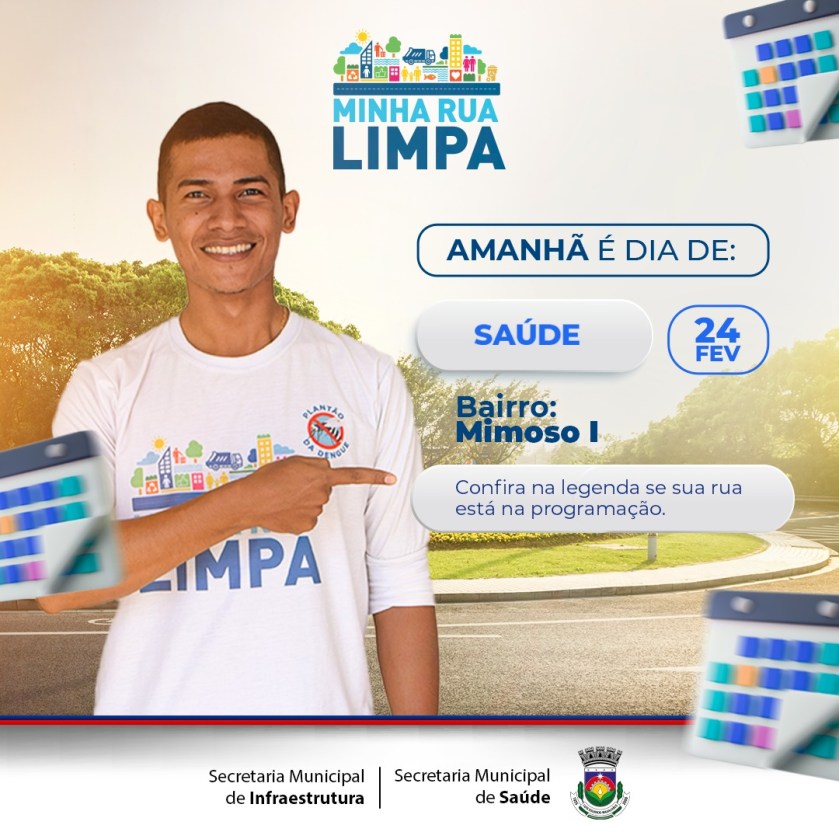 A Prefeitura de Luís Eduardo Magalhães, através das secretarias de Saúde e Infraestrutura, e sob coordenação da Vigilância Epidemiológica, inicia nesta segunda-feira (24), nos bairros Conquista e Mimoso I, o programa ‘Minha Rua Limpa’, de combate e prevenção ao Aedes aegypti.