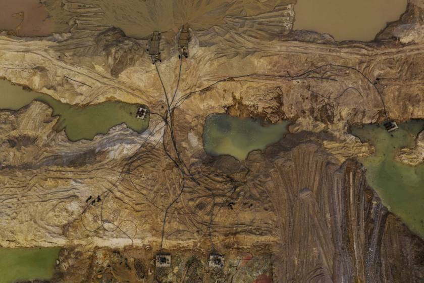 Vista aérea de garimpo de ouro localizado às margens do rio Peixoto de Azevedo, no norte do Mato Grosso, em setembro de 2019. Foto: Lalo de Almeida/Folhapress.