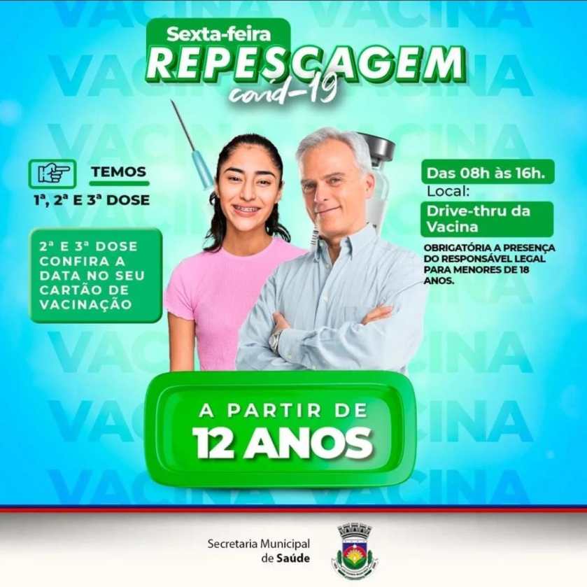 A Prefeitura de Luís Eduardo Magalhães, através da Secretaria de Saúde vai realizar nesta sexta-feira (28), mais uma repescagem da vacinação contra o Covid-19. Das 8h às 16h, no sistema Drive-Thru, no bairro Santa Cruz.