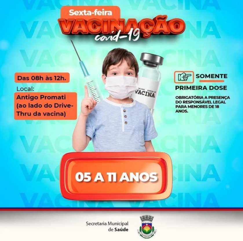 Continua nesta sexta-feira (28), a vacinação contra o Covid-19, para crianças de 5 a 11 anos, das 8h às 16h, na sede do antigo PROMATI, no bairro Santa Cruz, em Luís Eduardo Magalhães.