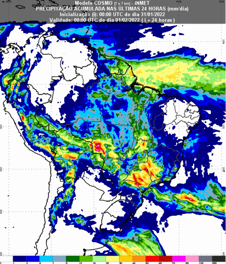 A Zona de Convergência do Atlântico Sul (ZCAS) vai seguir favorecendo a formação de nuvens carregadas em toda área até pelo menos a próxima quarta-feira, dia 2 de fevereiro. O norte paulista, região de produção agrícola como cana-de-açúcar, café e laranja também tem previsão de chuvas volumosas nas próximas 24 horas, entre 20mm e 40mm.