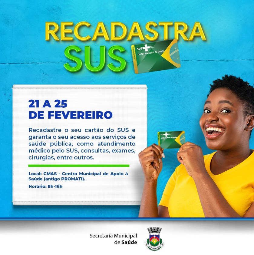 Com o objetivo de oferecer o Recadastramento do Cartão SUS de forma mais ampla para a comunidade, a Prefeitura de Luís Eduardo Magalhães, por meio da Secretaria de Saúde, vai promover um mutirão, entre os dias 21 e 25 de fevereiro, das 8h às 16h, no Centro Municipal de Apoio à Saúde (CMAS), antigo PROMATI, no bairro Santa Cruz.