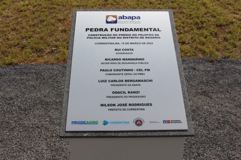 Com o lançamento da pedra fundamental, nesta terça-feira (15), e o início das obras previsto para abril, a região do Rosário, distrito do município de Correntina, no extremo Oeste da Bahia, dá um passo importante para o incremento da sua Segurança Pública, com a construção de um Posto Policial Militar. Trata-se de uma demanda antiga dos produtores rurais e da sociedade local, que agora está em vias de ser concretizada, graças à parceria entre a Associação Baiana dos Produtores de Algodão (Abapa), a Associação dos Agricultores e Irrigantes da Bahia (Aiba), a Polícia Militar e a Prefeitura Municipal de Correntina. As obras serão financiadas com recursos do Programa para o Desenvolvimento da Agropecuária (Prodeagro).
